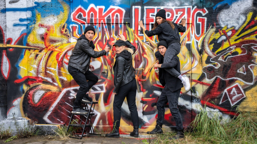 „Der Leipziger Künstler Gustav Sonntag kreierte den SOKOs ein Graffiti zum Staffelstart! Diese schlüpften spontan in die Rolle der Sprayer und wechselten für das Foto mal eben die Seiten.“ Marco Girnth (Jan Maybach), Melanie Marschke (Ina Zimmermann), Amy Mußul (Kim Nowak), Johannes Hendrik Langer (Moritz Brenner)
